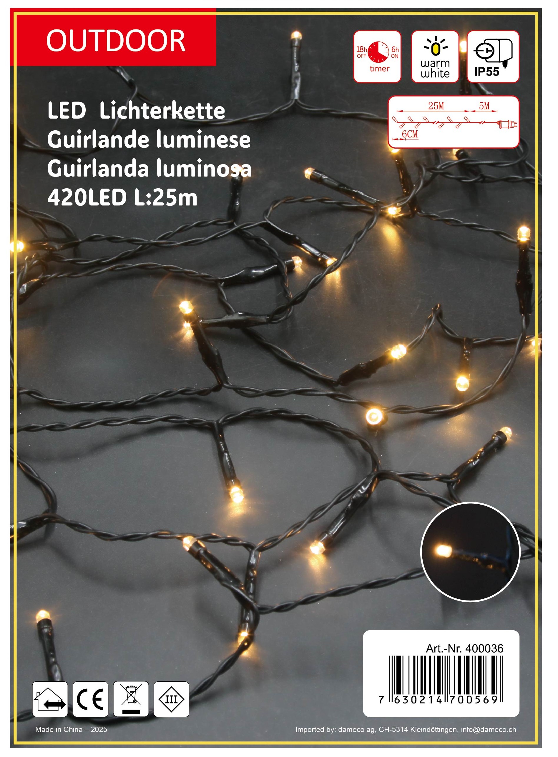 LED Outdoor Lichterkette 420 LED Warm weisses Licht L: 25m - Kabelfarbe: Grün